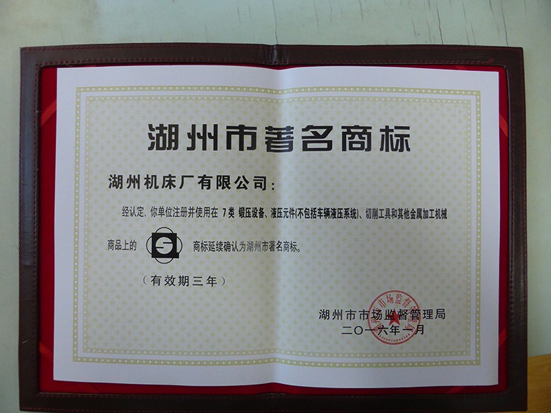 經湖州市市場監督管理局認定,我公司液壓機產品商標被延續確認為湖州市著名商標。有效期至2019年1月。