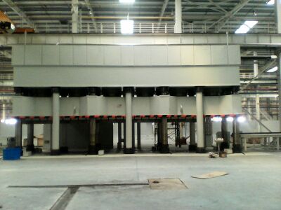 HJ087-7200噸汽車縱梁壓機配備移動工作臺,工作臺有效尺寸為左右12000mm,前后1400mm,移出距離14000mm,因此傳統的牽引機構無法保證移動工作臺的正常運行,所以采用了鏈輪式結構的移出方式,并取得了成功。產品實現了六個液壓墊同步和6個液壓墊缸單獨調壓,是我公司在縱梁壓機設計中一個新突破。